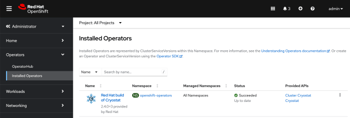 Once the OLM is running on our cluster, we can proceed to the Cryostat installation. We can find the required YAML manifest with the Subscription declaration in the Operator Hub. Let’s just apply the manifest to the target with the following command: