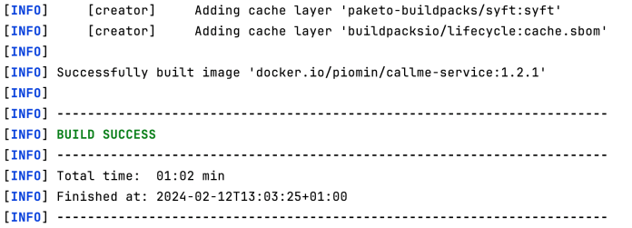 With the build-image profile activated, Spring Boot Maven Plugin builds the image of our app. You should have a similar result as shown below. In my case, the image tag is piomin/callme-service:1.2.1.