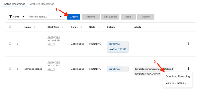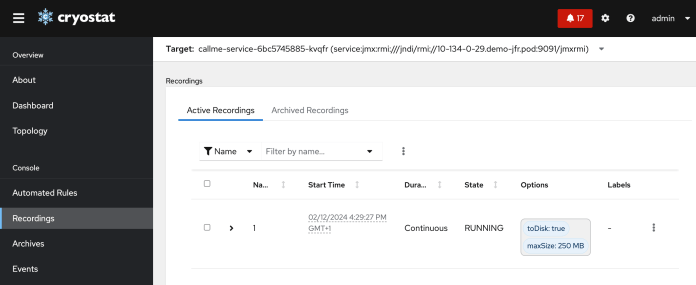 Then, we can go to the “Recordings” section. It shows a list of active recordings made by Java Flight Recorder for our app running on Kubernetes. By default, Cryostat creates and starts a single recording per each detected target.