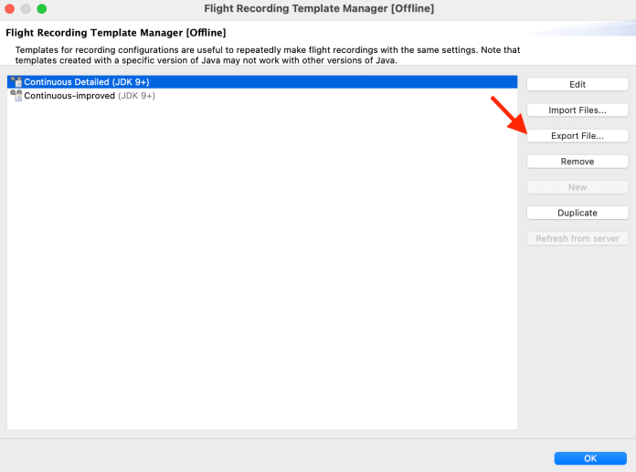 With the Flight Recording Template Manager, we can import and edit an exported event template. I choose the higher monitoring for “Garbage Collection”, “Allocation Profiling”, “Compiler”, and “Thread Dump”.