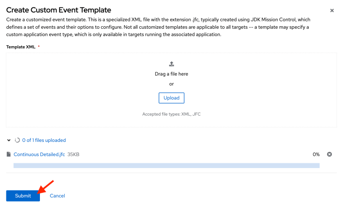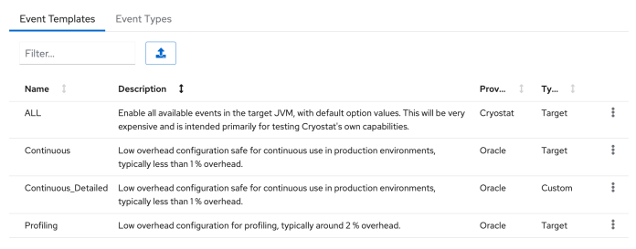 We can create a custom recording strategy by defining a new event template. Firstly, we need to go to the “Events” section, and then to the “Event Templates” tab. There are three built-in templates. We can use each of them as a base for our custom template. After deciding which of them to choose we can download it to our laptop. The default file extension is *.jfc.