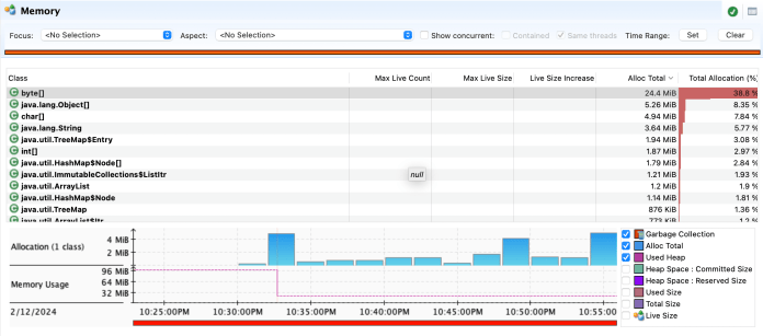 Let’s open the exported *.jfr file with Liberica Mission Control. Once we do it, we can analyze all the important aspects related to the performance of our Java app. We can display a table with memory allocation per the object type.