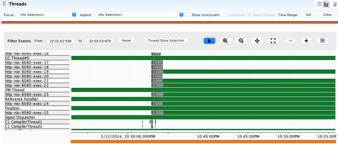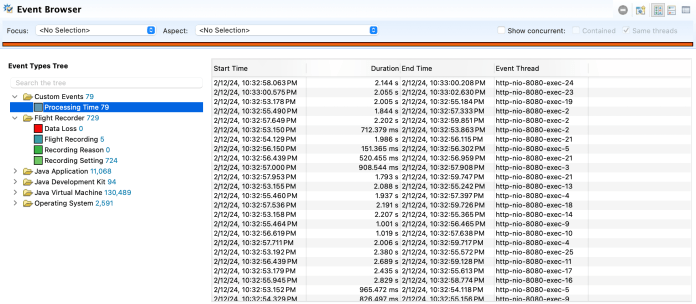 Finally, we go to the “Event Browser” section. In the “Custom Events” category we should find our custom event under the name determined by the @Label annotation on the ProcessingEvent class. We can see the history of all generated JFR events together with the duration, start time, and the name of the processing thread.