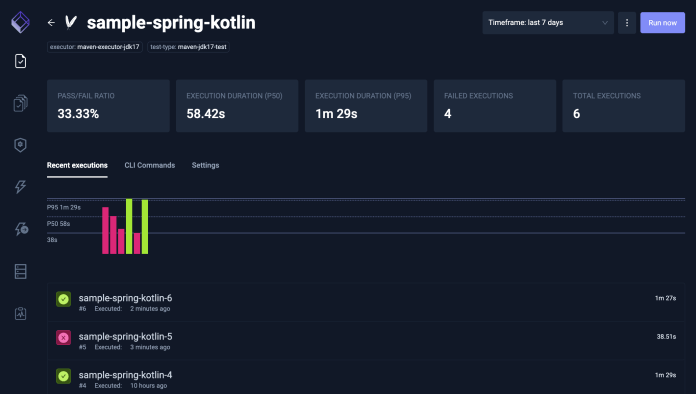Then, we can click the selected tile with the test to see the details. You will be redirected to the history of previous executions available in the “Recent executions” tab. There are six previous executions of our sample-spring-kotlin test. Two of them were finished successfully, the four others were failed.