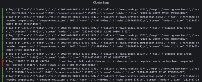 Once we login into the dashboard we will see the auto-configured Loki datasource. We can use it to get the latest logs from the Kubernetes cluster: