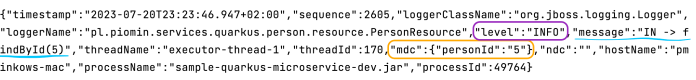 Besides the static logging fields, we will include a single dynamic field. We will use the MDC mechanism for that (1) (2). That field indicates the id of the person for whom we make the GET or POST request. Here’s the code of the REST controller: