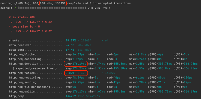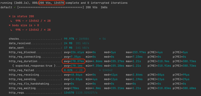 Finally, we have results for 200 users test. The application was able to process ~135k requests in 2 minutes with an average response time of ~175ms. The failure threshold was at the level of 0.02%.