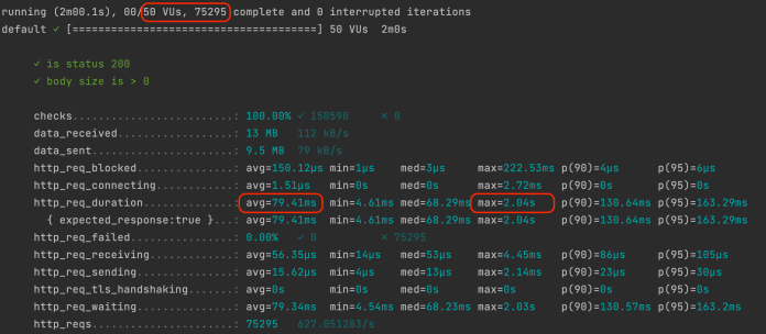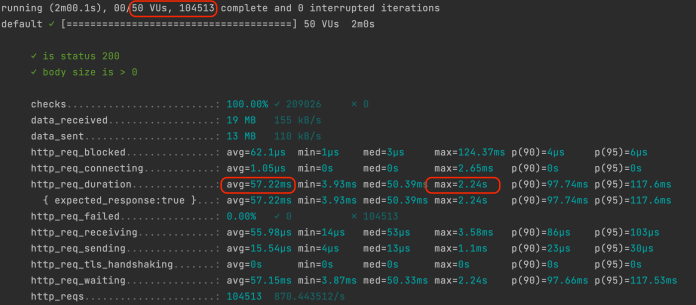 $ k6 run -u 50 -d 120s k6-test.js