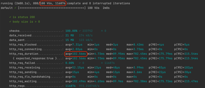 Here are the test results for 100 users. The application was able to process ~115k requests in 2 minutes with an average response time of ~100ms.