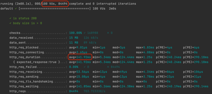 $ k6 run -u 100 -d 120s k6-test.js