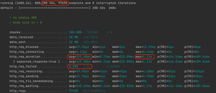 Finally, we have results for 200 users test. The application was able to process ~100k requests in 2 minutes with an average response time of ~240ms. Plus – there were no failures at the second 200 users attempt.