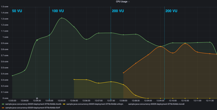 The same as in the previous section, here’s the diagram that shows memory usage at each phase of the test scenario. After simulating 100 users Knative scales up the number of instances. Theoretically, it should run the third instance of the app for 200 users. The memory usage for the first instance is around ~850MB (it includes also sidecar container usage).