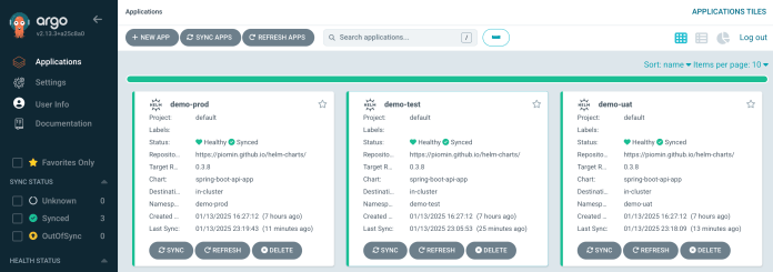 Let’s repeat the promotion process of the 1.0.0 version for the other two stages. Each stage should be at a healthy status. That status is read directly from the corresponding Argo CD Application.