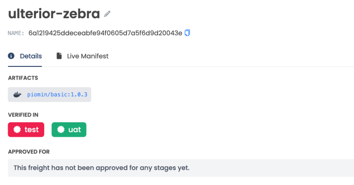 After clicking on the image tag tile, we will see its details. For example, the 1.0.3 tag has been verified on the test and uat stages. There is also an approval section. However, we still didn’t approve freight. To do that, we need to switch to the kargo CLI.