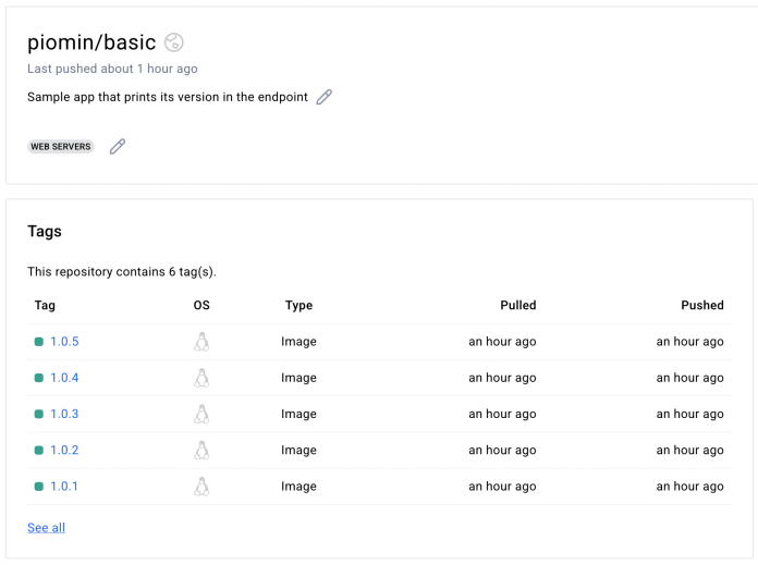 Let’s switch to the Docker Registry dashboard after pushing the 1.0.0 version.