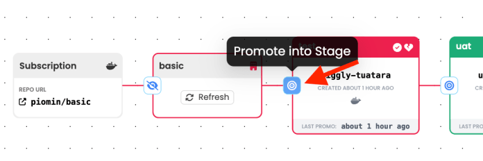 Once a new image tag is published to the registry, it becomes visible in the Kargo Dashboard. We must click the “Promote into Stage” button to promote a selected version to the target stage.