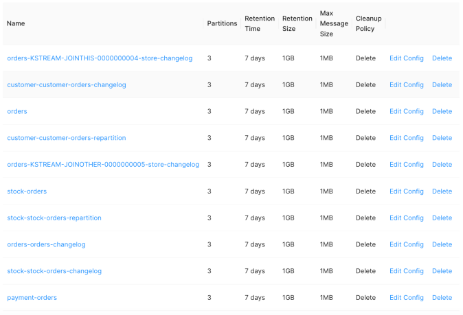 With Upstash you can easily display a list of topics. In total, there are 10 topics used in our sample system. Three of them are used directly by the Spring Boot applications, while the rest of them by the Kafka Streams in order to process stateful operations.