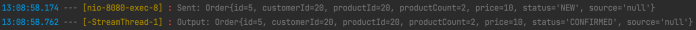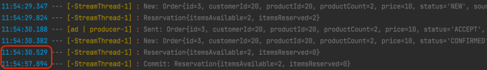 All three sample applications use Kafka Streams to process distributed transactions. Once the order is accepted by both stock-service and payment-service you should see the following entry in the order-service logs.