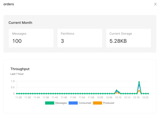 With Upstash UI you can also easily verify the number of messages incoming to the topics. Let’s see the current statistics for the orders topic.