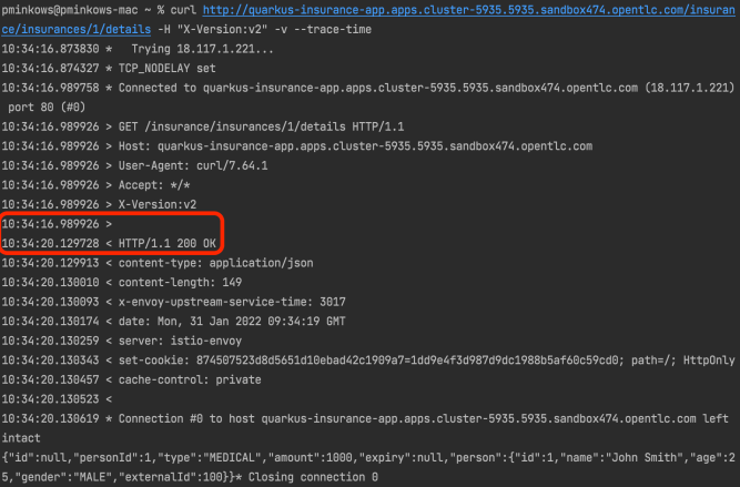 It takes some time before the command will finish. In the meanwhile, let’s try to send a single request to the insurance-app with the X-Version header set to v2. 50% of such requests are delayed by the Istio quarkus-person-app-vs VirtualService. Repeat the request until you have the response with 3s delay: