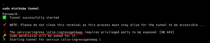 istioctl dashboard kialiShellSessionTo test access to the Istio mesh from outside the cluster, you need to expose the ingress gateway. To do this, run the minikube tunnel command.