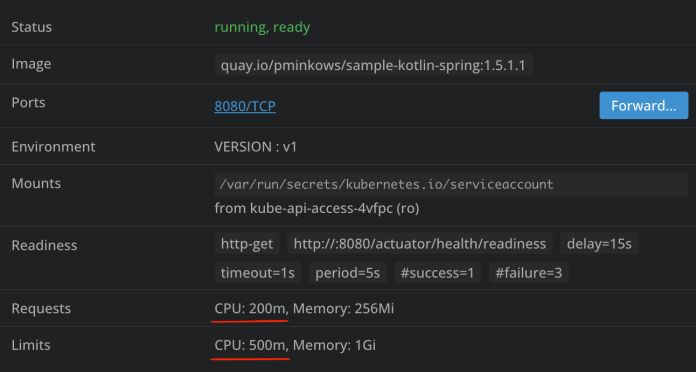 failureThreshold: 3YAMLHere are the pod requests and limits configured by Kube Startup CPU Boost. As you can see, the request is set to 300m, while the limit is completely removed.