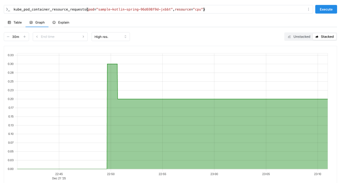 Now we can switch to the Prometheus console to see the history of CPU request values for our pod. As you can see, the request was temporarily increased during the pod startup.