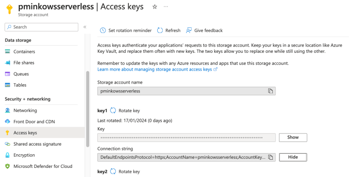 We also need to obtain the connection credentials to the Azure storage account. In your storage account, you should find the “Access keys” section and copy the value from the “Connection string” field.
