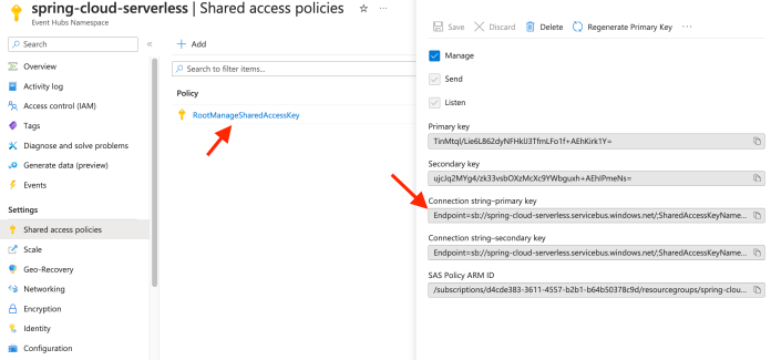 Before we deploy our functions on Azure, we can run and test them locally. I assume you have already the Azure Functions Core Tools according to the “Prerequisites” section. Our function still needs to connect with some services on the cloud like Azure Event Hubs or the storage account. The address to the Azure Event Hubs should be set as the EVENT_HUBS_CONNECTION_STRING app property or environment variable. In order to find the Event Hubs connection string, we should switch to the Azure Portal and find the spring-cloud-serverless namespace. Then, we need to go to the “Shared access policies” menu item and click the “RootManagedSharedAccessKey” policy. The connection string value is available in the “Connection string-primary key” field.