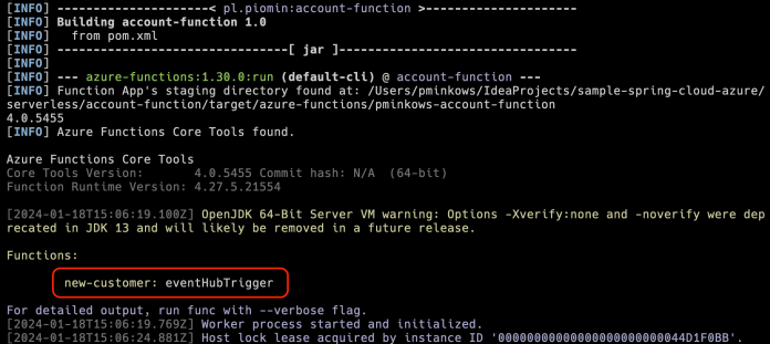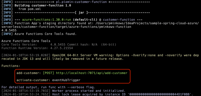 Let’s begin with the customer-function app. Before deploying the app we need to build it first with the mvn clean package command. Once you do it you can run your first function Azure with the following command: