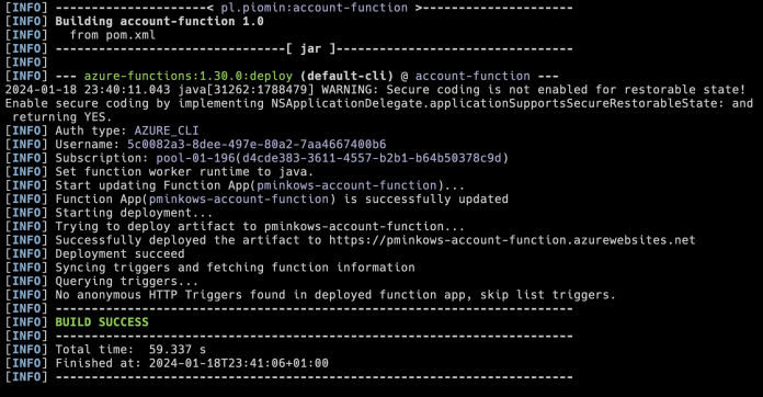 Let’s switch to the account-function directory. We will deploy it to the Azure pminkows-account-function function. Once again we need to build the app with mvn clean package command, and then deploy it using the mvn azure-functions:deploy command. Here’s the output. There are no HTTP triggers defined, but just a single function triggered by the Azure Event Hub.