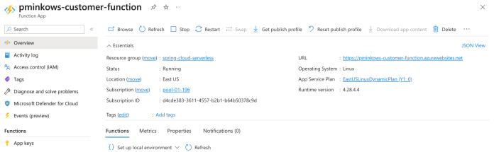 Let’s take a look at the pminkows-customer-function Azure Function App before we deploy our first app there. The http://pminkows-customer-function.azurewebsites.net base URL will precede all the HTTP endpoint URLs for our functions. We should remember the name of the automatically generated service plan (EastUSLinuxDynamicPlan).