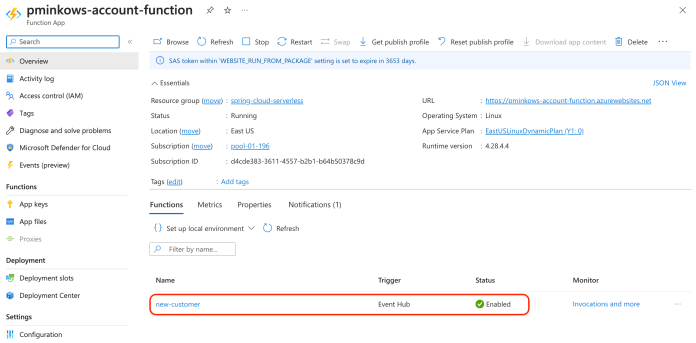 Here’s the command output for the account-function app. As you see, it contains a single function new-customer activated through the Event Hub trigger.