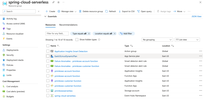 Now, let’s switch to the Azure Portal. Find the spring-cloud-serverless resource group. You should have the same list of resources inside this group as shown below. It means that our environment is ready and we can proceed to the source code.