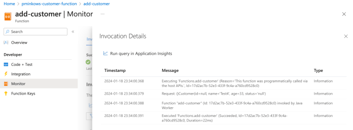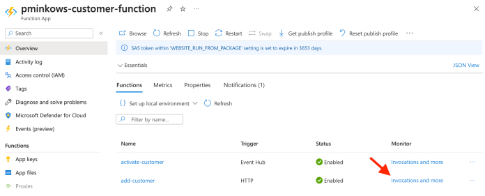 After that, we should switch to the Azure Portal. Go to the pminkows-customer-function details and click the link “Invocation and more” on the add-customer function.
