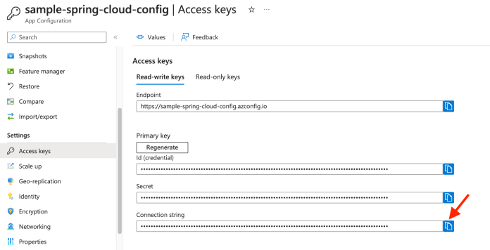 That’s all. Now, we are ready to run our app. We just need to connect it to the Azure App Configuration service. In order to do that, we need to obtain its connection endpoint and credentials. You can go to the “Access keys” menu item in the “Settings” section. Then you should copy the value from the “Connection string” field as shown below. Alternatively, you can obtain the same information by executing the following CLI command: az appconfig credential list --name sample-spring-cloud-config.