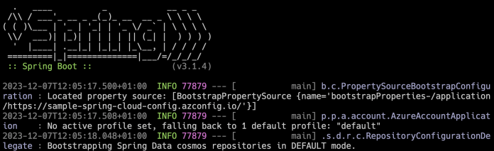 Finally, we can run our sample Spring Boot app. For now, we will just run it locally. As a result, it will connect to the Azure App Configuration and Cosmos DB deployed on the cloud. We can execute the following Maven command to start the app: