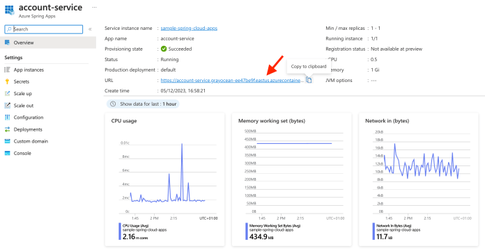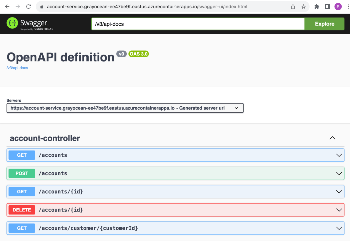 We can display the account-service app details. The app is exposed under the public URL. We just need to copy the link.