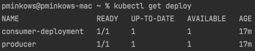 Once autoscaling occurs we can display a list of deployments. As you see, now there are 5 running pods of the consumer service.