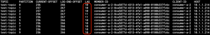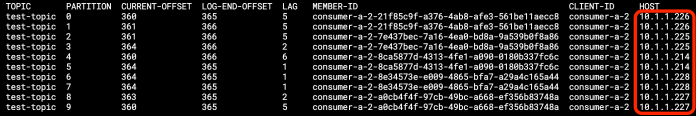 Once again let’s verify the status of our Kafka consumer group. There 5 consumers on the topic partitions.