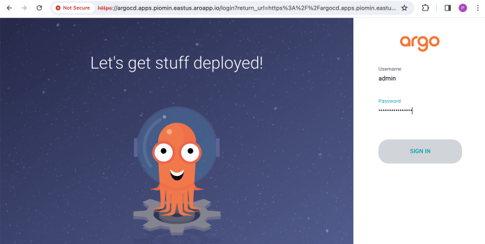 --set server.route.hostname=argocd.apps.piomin.eastus.aroapp.ioShellSessionAfter that, we can access the Argo CD dashboard using the Route address as shown below. The admin user password may be taken from the argocd-initial-admin-secret Secret generated by the Helm chart.