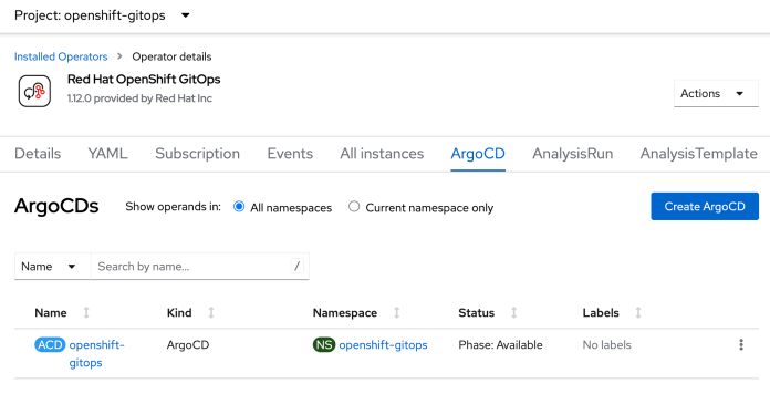 During the installation, the operator automatically creates the Argo CD instance in the openshift-gitops namespace.