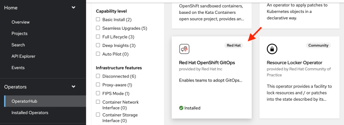 The solution presented in the previous section works fine. However, it is not the optimal approach for OpenShift. In that case, the better idea is to use OpenShift GitOps Operator. Firstly, we should find the “Red Hat GitOps Operator” inside the “Operator Hub” section in the OpenShift Console. Then, we have to install the operator.