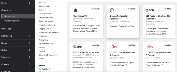 postgresqlDataDir: /var/lib/pgsql/dataYAMLOf course, we can consider switching to one of the available Postgres operators. From the “Operator Hub” section we can install e.g. Postgres using Crunchy or EDB operators. However, these are not operators provided by Red Hat. Of course, you can use them on “vanilla” Kubernetes as well. In that case, the migration to OpenShift also won’t be complicated.