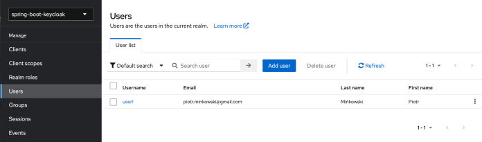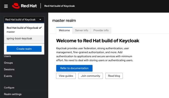 After logging to the Keycloak UI with the admin / admin crendentials you should see the spring-boot-keycloak realm.