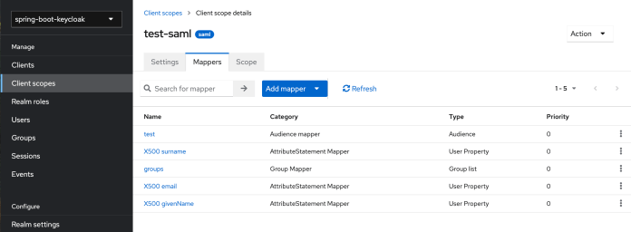 This is the optional step. We can add the client scope with some mappers. This force Keycloak to pass information about user group, email, and surname in the authentication response.