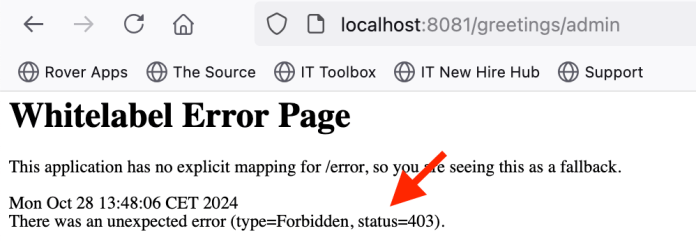 Then, let’s call the GET /greetings/admin endpoint. Unfortunately, we don’t have the access to that endpoint. That’s because it requires the user to have the ROLE_ADMINS authority.