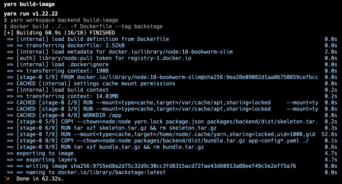 $ yarn build:backend ShellSessionThe repository with Backstage already contains the Dockerfile. You can find it in the packages/backend directory.