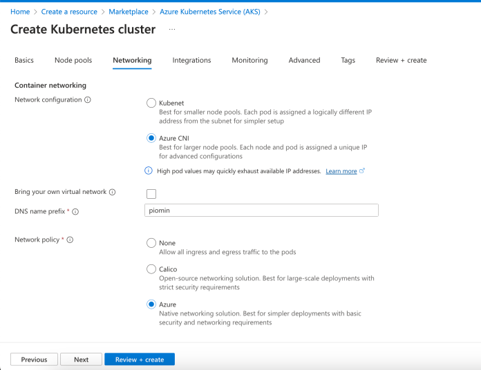 We also won’t change anything in the “Node pools” section. On the “Networking” page, we choose “Azure CNI” instead of "Kubenet" as network configuration, and “Azure” instead of “Calico” as network policy. In comparison to Kubenet, the Azure CNI simplifies integration between Kubernetes and Azure Application Gateway.