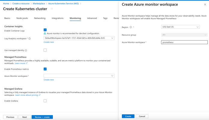 We will also provide some changes in the Monitoring section. The main goal here is to enable managed Prometheus service for our cluster. In order to do it, we need to create a new workspace in Azure Monitor. The name of my workspace is prometheus.